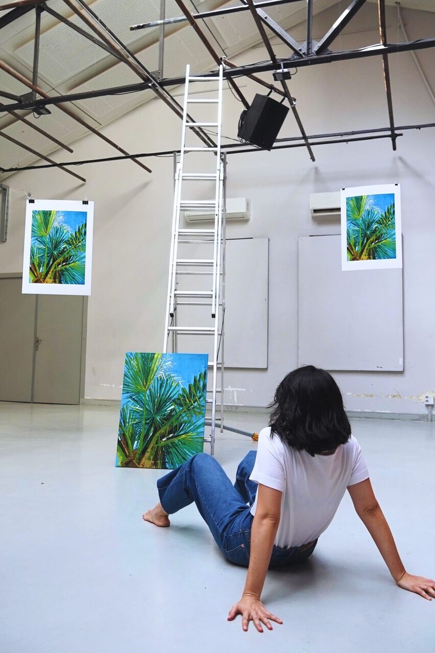 A “Palmera” la conocí y disfruté una mañana en una casita familiar de Huelva. Mientras todos seguían remoloneando en la cama yo me escapé. Una bungavilla enorme había llenado de pétalos rosas la piscina de agua tibia azul turquesa. El sol ya picaba y la palmera me ofreció un techo abierto a bellos pensamientos. La brisilla tempranera movía los finísimos extremos de las puntiagudas hojas, con formas amenazantes. Un grupo de abanicos enormes y sus pícaros dedos afilados. El monstruo más bello era mi cuna.